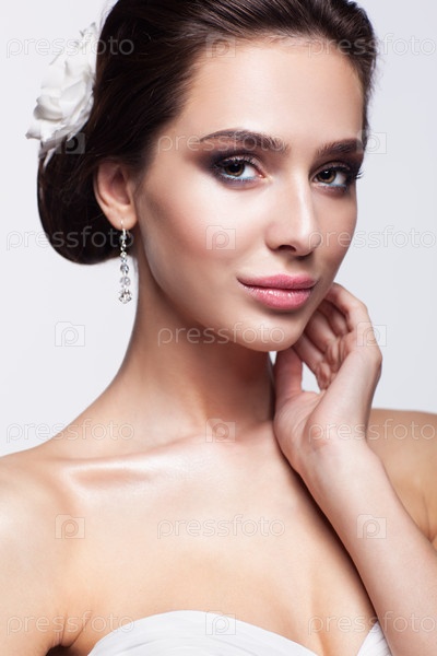 Портрет красивой молодой брюнетки невесты в белом свадебном платье на светло-сером фоне