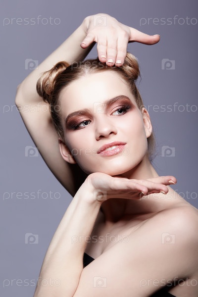 Портрет молодой девушки-подростка с дневным макияжем и прической в виде пучка