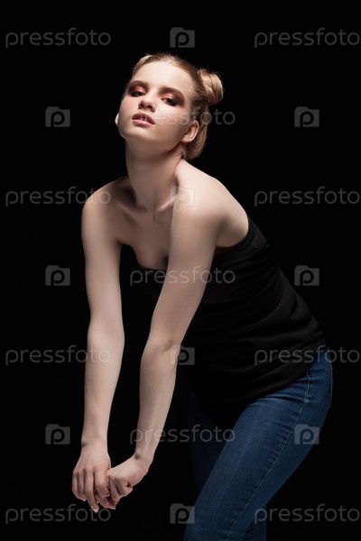 Портрет молодой девушки-подростка с низким ключом и дневным макияжем на черном