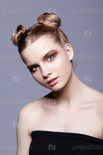 Портрет молодой девушки-подростка с дневным макияжем и прической в виде пучка