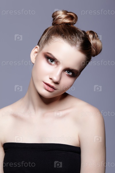 Портрет молодой девушки-подростка с дневным макияжем и прической в виде пучка