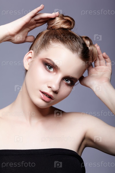 Портрет молодой девушки-подростка с дневным макияжем и прической в виде пучка