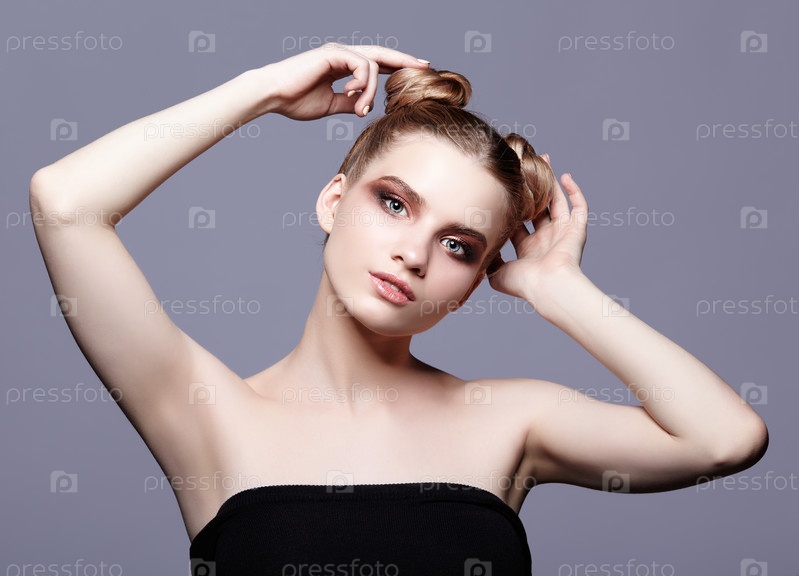 Портрет молодой девушки-подростка с дневным макияжем и прической в виде пучка