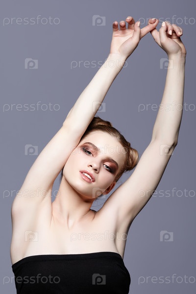 Портрет молодой девушки-подростка с прической в виде пучка и поднятыми руками на сером