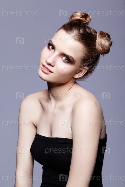 Портрет молодой девушки-подростка с дневным макияжем и прической в виде пучка