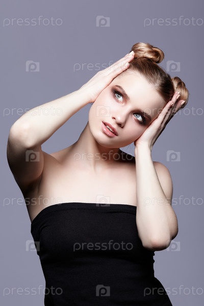 Портрет молодой девушки-подростка с дневным макияжем и прической в виде пучка
