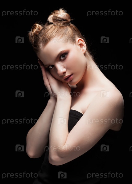 Портрет молодой девушки-подростка с низким ключом и дневным макияжем на черном