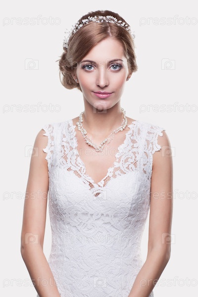Портрет красивой молодой блондинки-невесты в белом свадебном платье