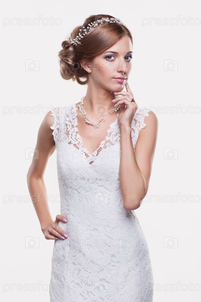 Портрет красивой молодой блондинки-невесты в белом свадебном платье