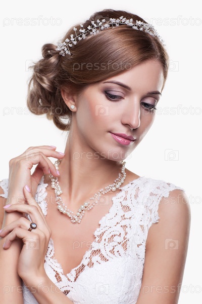 Портрет красивой молодой блондинки-невесты в белом свадебном платье