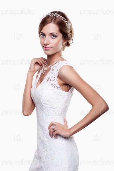Портрет красивой молодой блондинки-невесты в белом свадебном платье