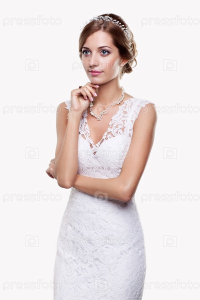 Портрет красивой молодой блондинки-невесты в белом свадебном платье