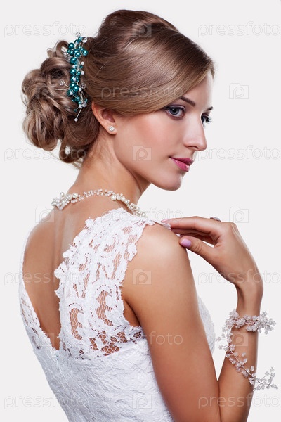 Портрет красивой молодой блондинки-невесты в белом свадебном платье