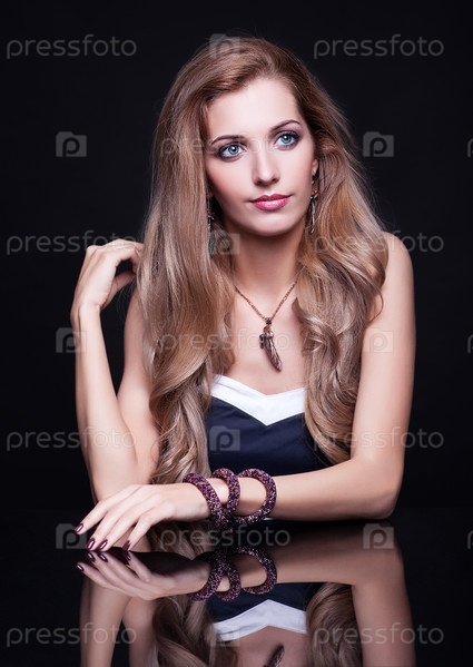Молодая красивая блондинка сидит за зеркальным столом на черном фоне