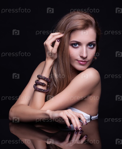 Молодая красивая блондинка сидит за зеркальным столом на черном фоне