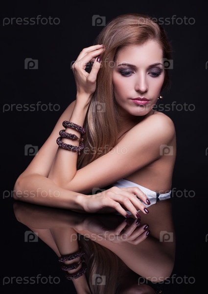 Молодая красивая блондинка сидит за зеркальным столом на черном фоне