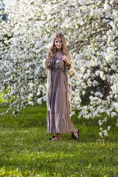Красивая молодая женщина в длинном платье в стиле бохо на зеленой траве под цветущей яблоней в саду