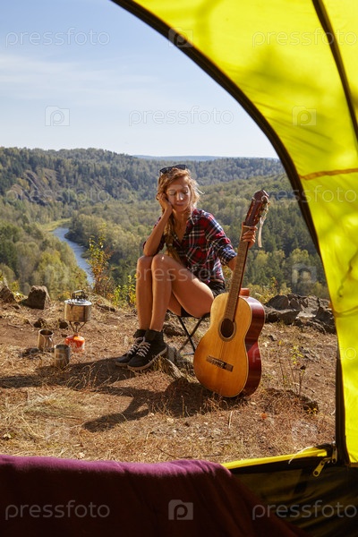 Молодая блондинка-туристка с гитарой в лагере на скале над рекой и лесным ландшафтом