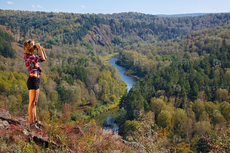 Молодая блондинка-туристка на скале смотрит в бинокль на осенний пейзаж с рекой Берд