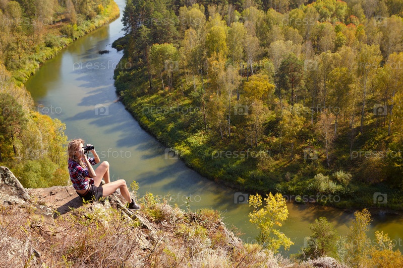 Молодая блондинка-туристка на скале смотрит в бинокль на осенний пейзаж с рекой Берд
