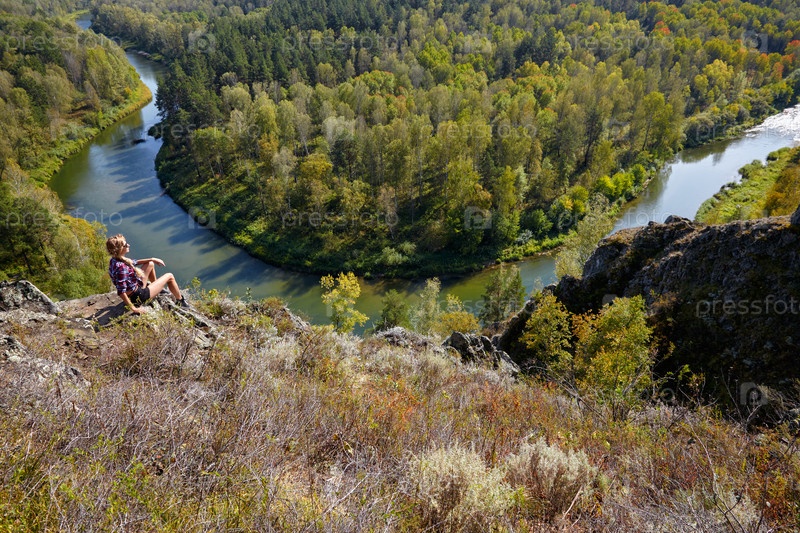 Молодая блондинка-туристка сидит на скале на фоне сибирского осеннего пейзажа с рекой Берд