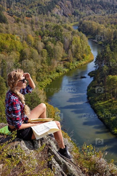 Молодая блондинка-туристка сидит на скале с картой в руках на фоне сибирского осеннего пейзажа с рекой Берд
