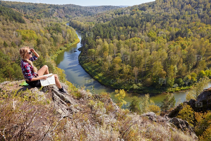 Молодая блондинка-туристка сидит на скале с картой в руках на фоне сибирского осеннего пейзажа с рекой Берд