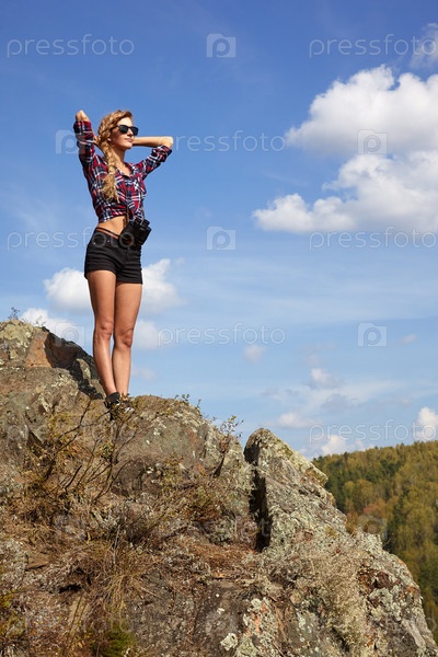 Молодая блондинка-туристка в рубашке и шортах на скале на фоне голубого неба. Россия, Сибирь, Салаир