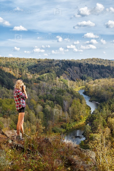 Молодая блондинка-туристка на скале фотографирует осенний пейзаж с рекой Берд на старую кинокамеру