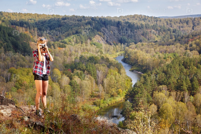 Молодая блондинка-туристка на скале фотографирует осенний пейзаж с рекой Берд на старую кинокамеру