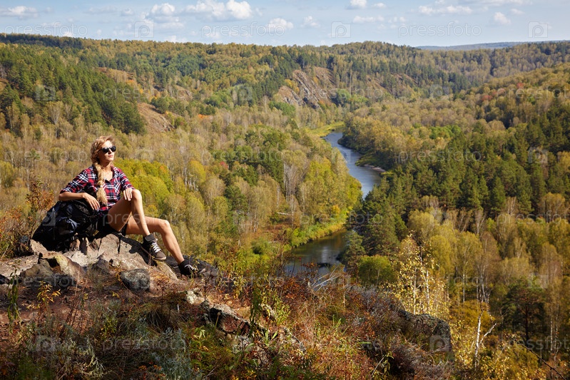 Молодая блондинка-туристка с рюкзаком сидит на скале на фоне сибирского осеннего пейзажа с рекой Берд