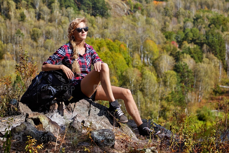Молодая блондинка-туристка с рюкзаком сидит на скале на фоне сибирского осеннего пейзажа