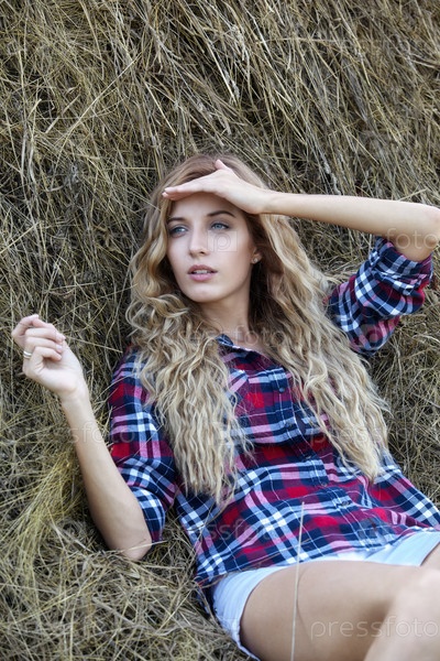 Молодая белокурая деревенская девушка возле стога сена