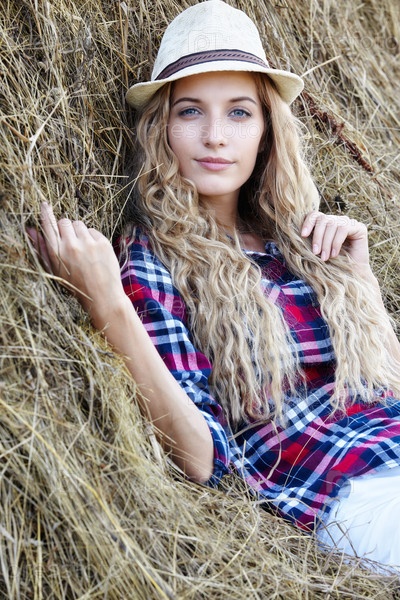 Молодая белокурая деревенская девушка в шляпе возле стога сена