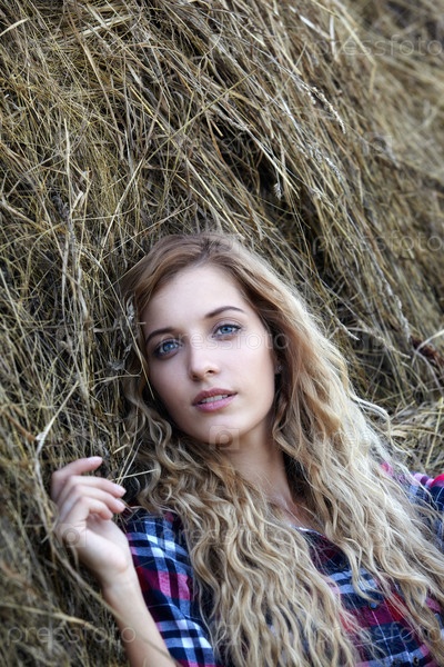 Молодая белокурая голубоглазая деревенская девушка возле стога сена