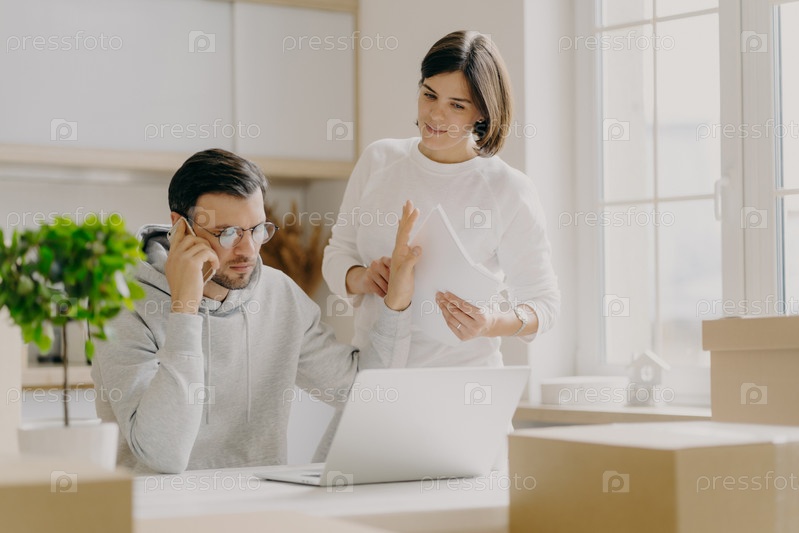Серьезный мужчина звонит по смартфону, делает жест отказа, носит очки и толстовку, просит жену подождать, пытается решить финансовые проблемы, позирует на кухне с большими окнами, окруженными коробками