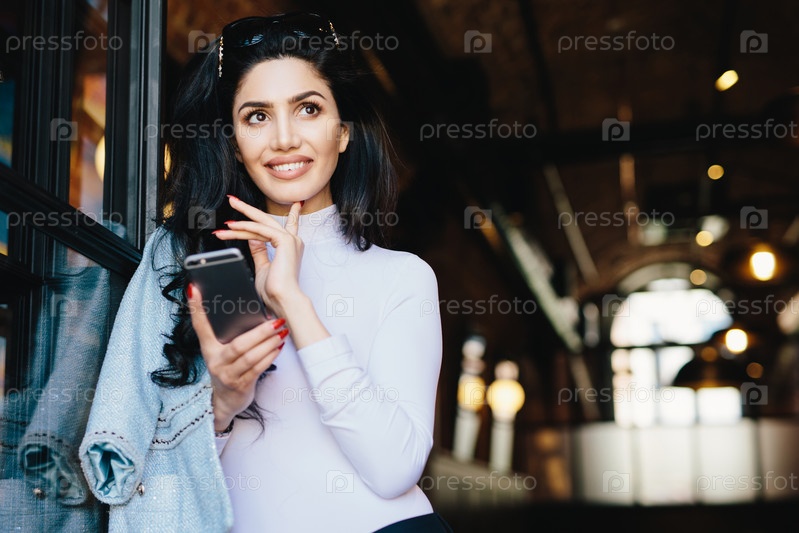 Портрет вдумчивой гламурной женщины с темными волосами в солнечных очках и белой формальной одежде, просматривающей социальные сети с помощью смартфона, наслаждающейся онлайн-общением, позирующей на фоне интерьера кафе
