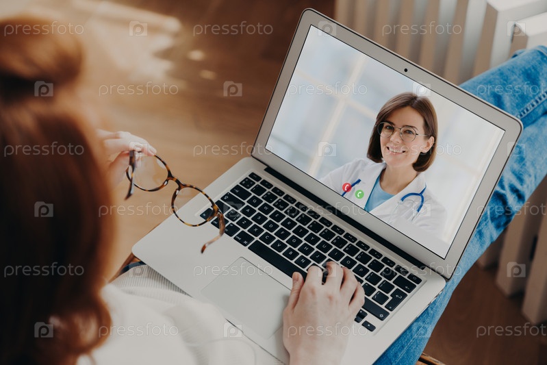 Неузнаваемая женщина ведет видеочат с опытным врачом на ноутбуке, получает консультацию во время карантина, обсуждает лечение болезни. Видеочат с терапевтом. Вид сзади сзади