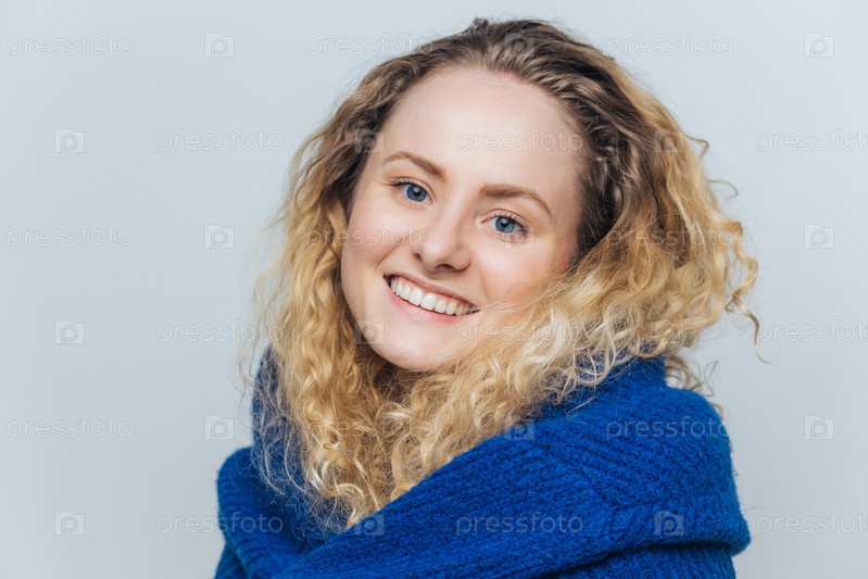 Довольно улыбающаяся молодая радостная женщина с голубыми теплыми глазами, здоровой кожей и белыми идеальными зубами, одетая в теплый свитер, радуется предстоящим выходным, изолированная на голубом фоне, модели в помещении