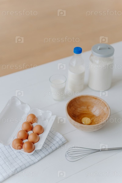 Ингредиенты для приготовления теста или кондитерских изделий. Свежие яйца, молоко и мука с венчиком на белом деревянном кухонном столе. Продукты для приготовления пищи. Вертикальный выстрел