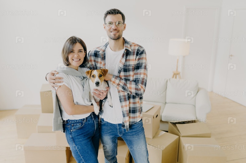 Нежная семейная пара празднует день переезда, обнимает и держит любимого питомца, наслаждается переездом и начинает жить вместе, позирует в большой комнате среди картонных коробок. Концепция ипотеки и переезда