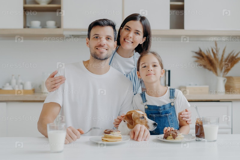 Семья, отдых, времяпрепровождение, концепция еды. Отец, мать и дочь, джек-рассел-терьер позируют все вместе перед камерой на фоне кухонного интерьера, получают удовольствие от еды блинов, пить свежее молоко