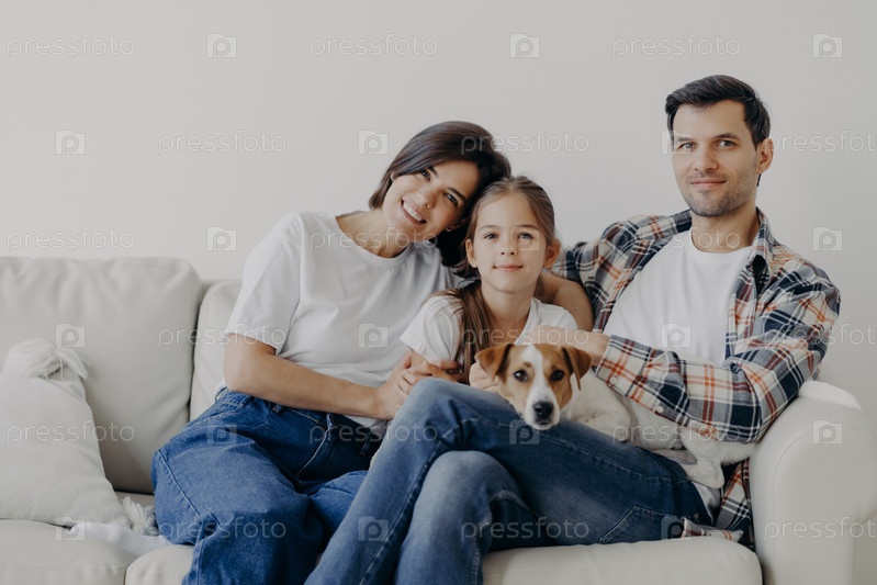 Портрет нежной семьи обнимаются и сидят вместе на диване в гостиной, меняют свой дом, имеют счастливые выражения. Отец, мать, дочь и собака позируют для портрета, хорошо проводят время