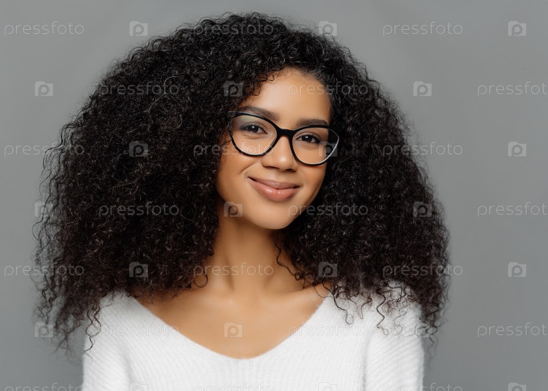 Крупным планом портрет восхищенной красивой афро-женщины с густыми вьющимися волосами, смотрит через прозрачные очки, носит белый свитер, позирует на серой стене студии. Этническая принадлежность, красота, мимика