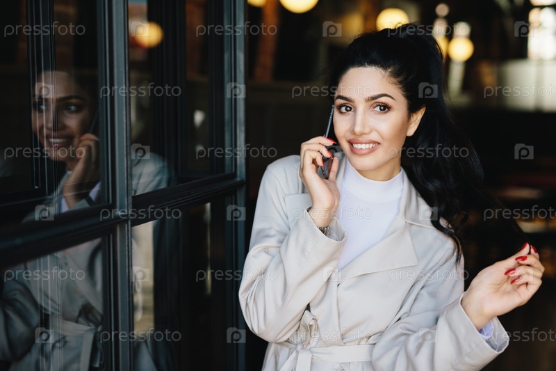 Счастливая очаровательная брюнетка с привлекательной внешностью, одетая в белую одежду, разговаривает по мобильному телефону и сплетничает со своей подругой. Молодая деловая женщина общается по современному мобильному телефону