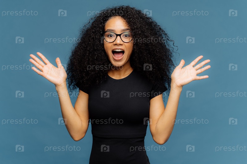 Эмоционально возбужденная темнокожая дама поднимает ладони, широко открывает рот, громко восклицает, носит черный наряд, разводит руки, изолирована на синем фоне. Впечатленная позитивная женщина кричит от радости