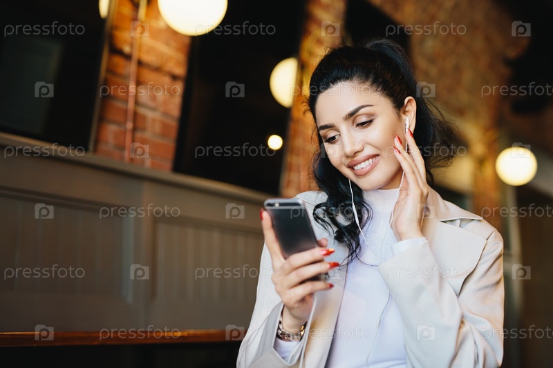 Улыбающаяся женщина с темными волосами, завязанными в конский хвост, в белой одежде держит смартфон и слушает музыку на своем электронном устройстве. Стильная женщина отдыхает в кафе с помощью приложения с улыбкой на лице