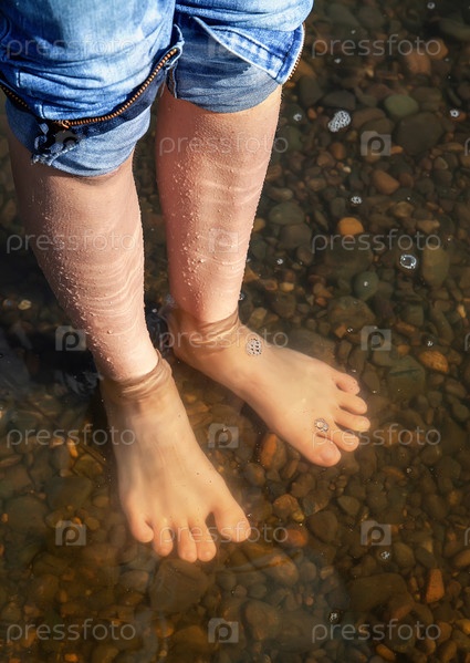 Летний туризм и путешествия. ноги подростка в синих джинсах в воде в реке. мелкие камни в воде