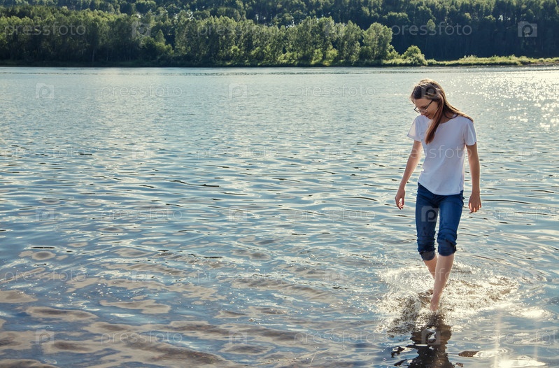 Маленькая девочка в джинсах с длинными волосами у реки. Сибирская река Томь