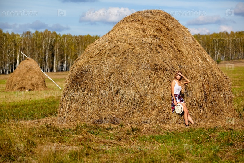 Молодая белокурая деревенская девушка в шляпе возле стога сена